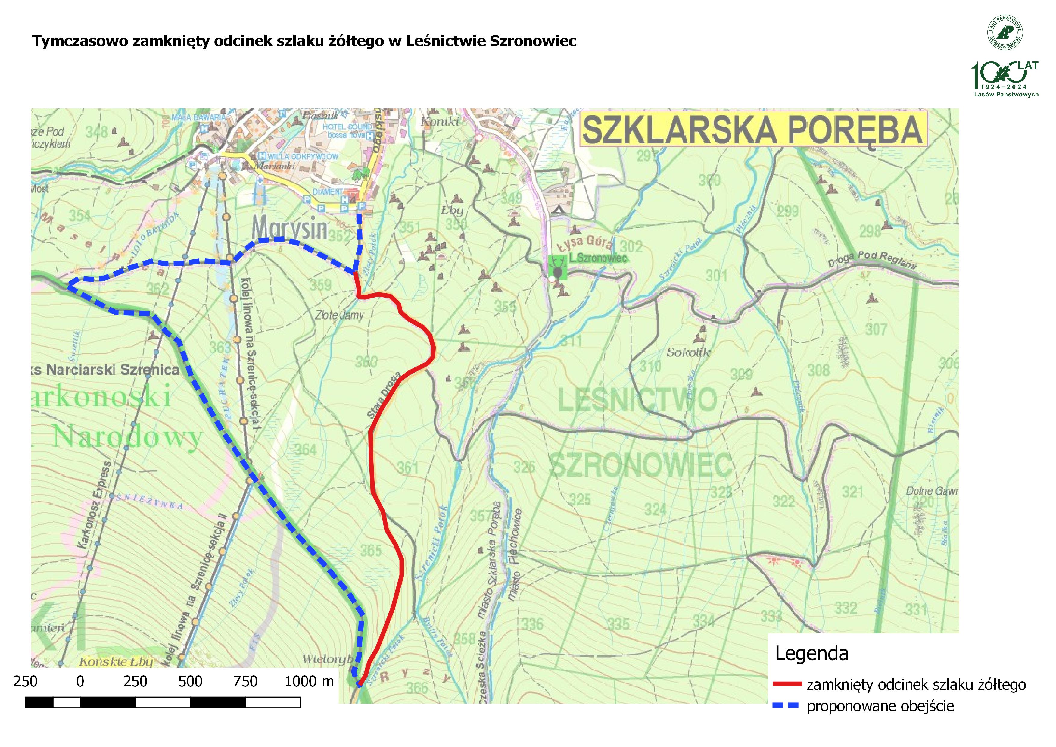 Informujemy, że od 22.09.2025 r. do 10.10.2025 r. ze względu na prowadzenie prac gospodarczych zamknięty zostaje odcinek szlaku żółtego prowadzącego do Schroniska Pod Łabskim Szczytem w Leśnictwie Szronowiec.