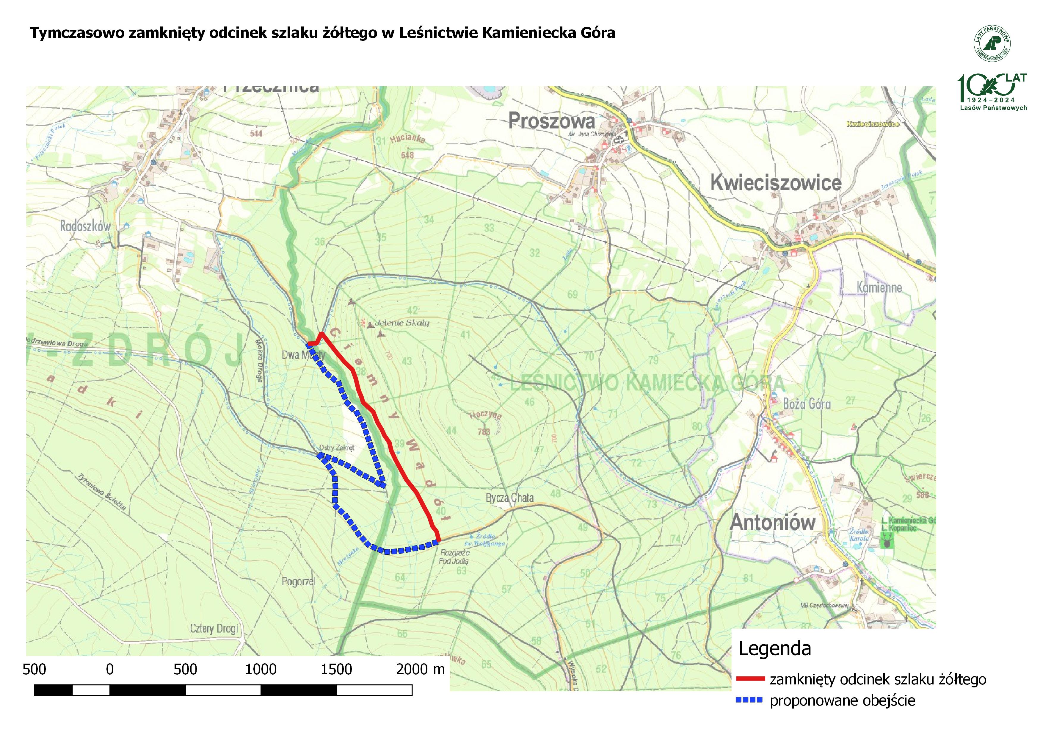 Informujemy, że od dnia 01.09.2025 r. do 30.09.2025 r., ze względu na prowadzenie prac gospodarczych zamknięty zostaje odcinek szlaku żółtego w okolicach Jelenich Skał w Leśnictwie Kamieniecka Góra.